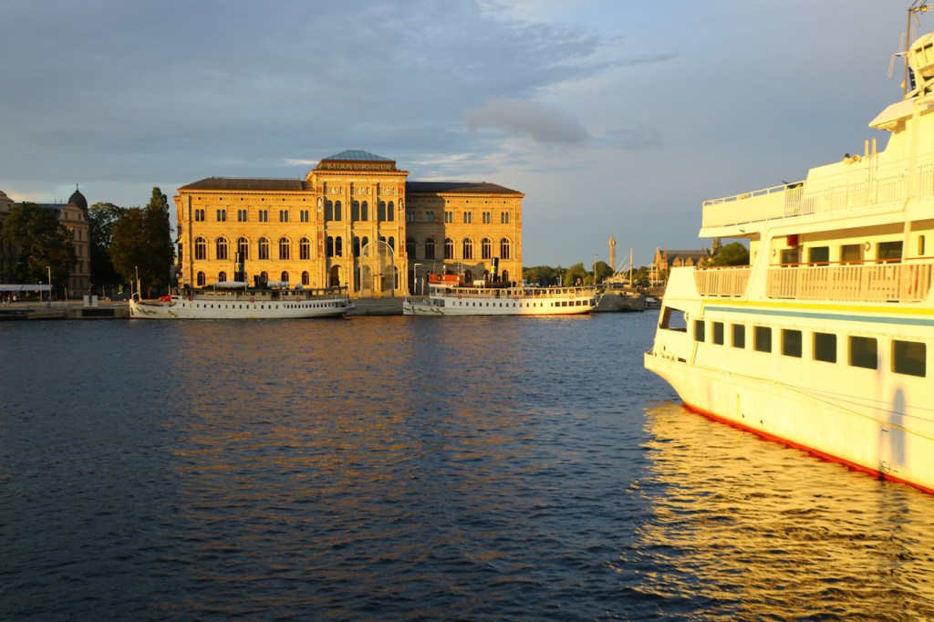 Här syns Waxholmsbolagets ångfartyg Storskär och Norrskär liggandes nedanför Nationalmuseum, tillbaka i stan efter resor till Husarö respektive Sandhamn. Fantastisk ångbåtstrafik som Stockholm har.