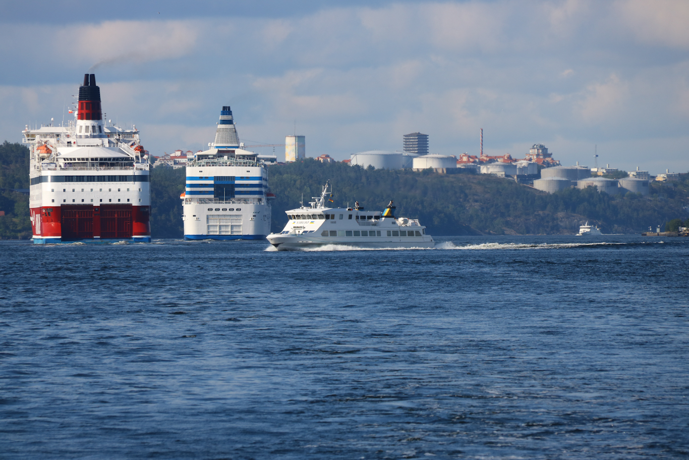 Finlandsfärjor på väg in till Stockholm, medan skärgårdsbåtarna är på väg ut i Stockholms vidsträckta arkipelag. Snabbåten närmast i bild är m/s Viberö – och vad namnet beträffar så ligger Viberön strax söder om Arholma. Det byggdes fem större snabbåtar i början av 1990-talet för Waxholmsbolaget och alla fem båtar fick ö-namn på V. Värmdö, Vånö, Väddö, Viberö och Vaxö. Dessa utgör efter 30 år drygt fortfarande stommen i skärgårdstrafiken.