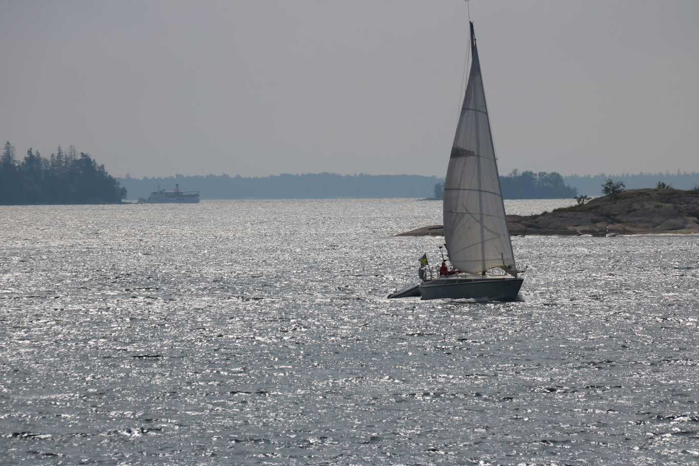Seglare och i bakgrunden en skärgårdsbåt på väg in till den södra av örorna. Och med ”örorna” menas då Norröra och Söderöra, två öar belägna utanför nordöstra Blidö. Vädret denna dag var lite blåsigt och inte så varmt som det varit i juli – men helt okej ändå.