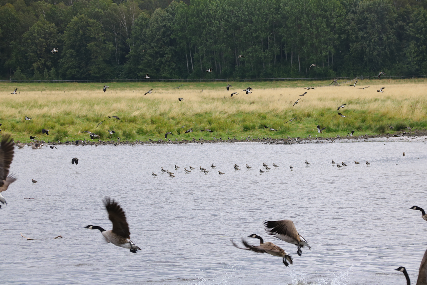 Det är sensommar och det betyder att flyttfåglar är i farten. På bilden syns förutom kanadagäss och andra gäss även tofsvipor som har ett karaktäristiskt läte när de far fram över våt- och åkermarker. Här samlades ett stort antal tofsvipor som var på sin vakt efter att Tranan passerat (passade namn med tanke på fåglar) och så Blidösund. Gässen blev oroliga när hälsningarna utbyttes mellan fartygen.