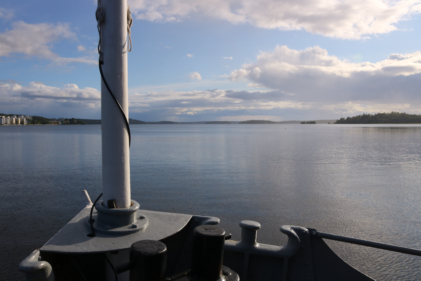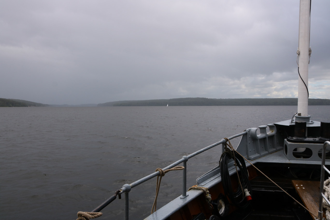 När Sigtuna sedan lämnades kl 16:00 så kom ett ordentligt regnväder. Det tycks vara en period nu med många lokala skurar som dyker upp till och från – och så var det på denna resa ifrån Uppsala. Men då är det ju skönt att vara ombord på en varm och ombonad ångbåt. Sigtunafjärden heter vattnet utanför Sigtuna inte helt ologiskt.
