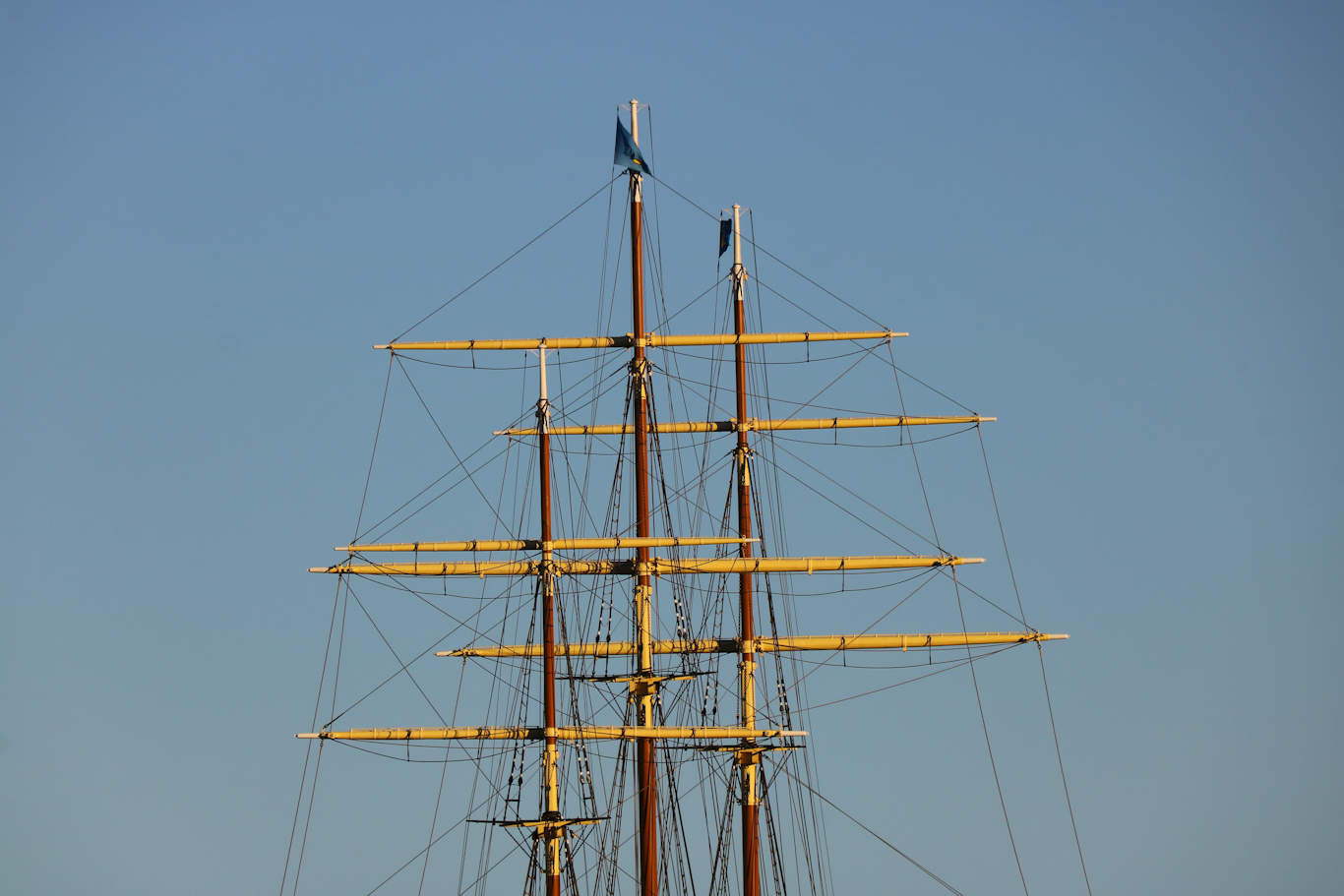 Riggen på Af Chapman som renoverades för några år sedan. Af Chapman som är byggd 1888 och som från början gick fraktresor med Australien som mål innan hon några år in på 1900-talet såldes upp till dessa nordiska trakter och kom att vara ett skolskepp fram till 1930-talet. Vandrarhem i STF:s regi har hon varit sedan 1949 vid Skeppsholmen i Stockholm, hur det blir framöver återstår väl att se när höjda hyror pressar verksamheten.