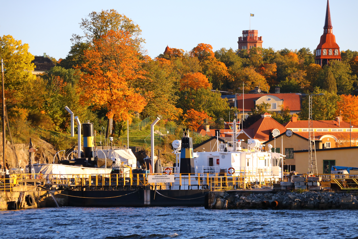 Skönheten och odjuret på Beckholmen i form av s/s Norrskär och m/s Waxholm I. Ångfartyget väntar på nästa vår efter en trafiktät sommar medan motorfartyget väntar på att få komma ut i trafik efter en sommar stillaliggande vid kaj av tekniska orsaker.