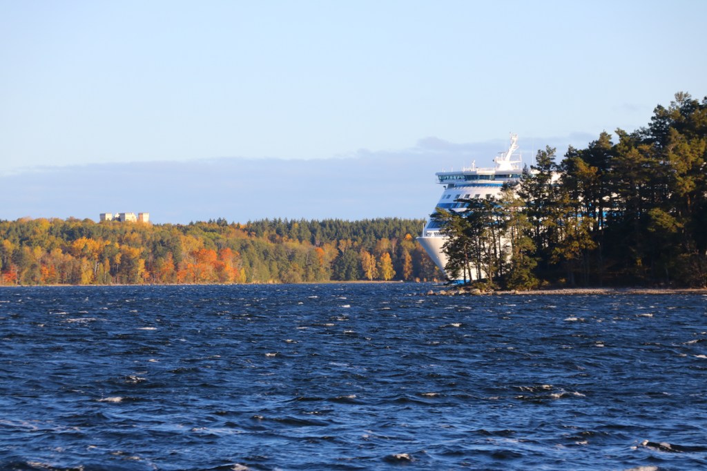 Bakom ön Stora Höggarn gömmer sig m/s Silja Serenade som tillsammans med systerfartyget m/s Silja Symphony kör på mellan Stockholm och Helsingfors via Mariehamn. Här är hon ju på ingående mot Stockholm, och i bakgrunden träder Bogesunds slott upp bland de höstfärgade träden på Bogesundslandet.