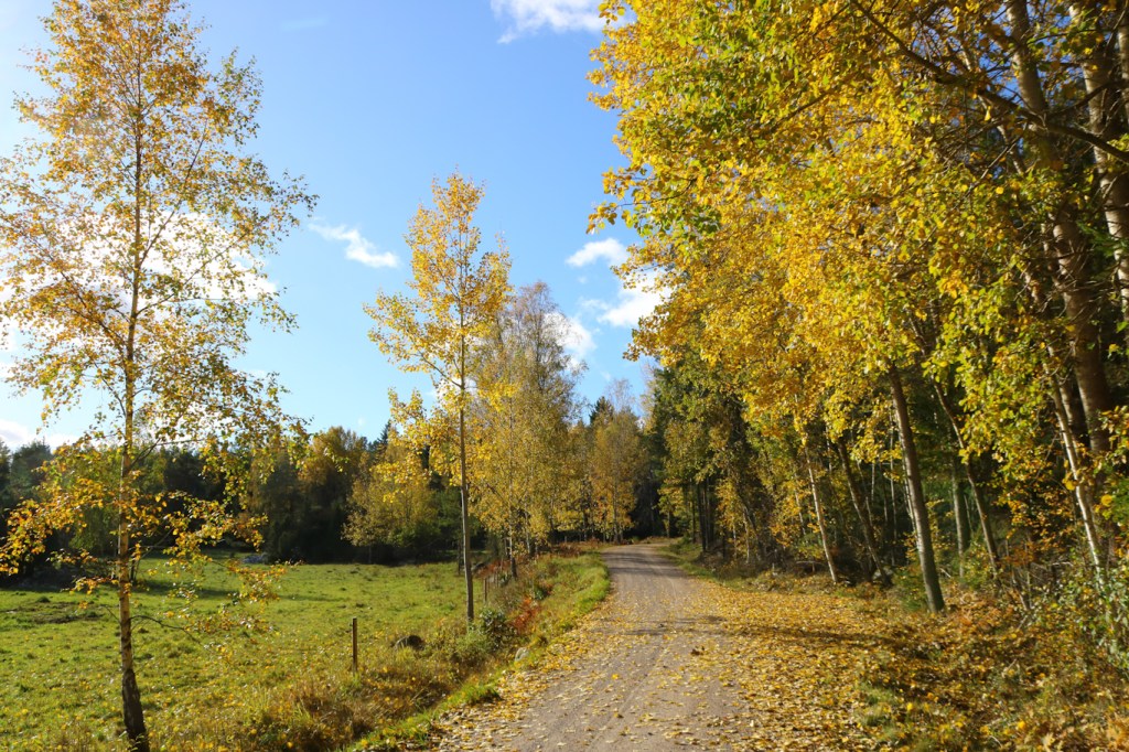Fortsatt traskande i fantastiska färger. När jag var liten så drogs jag i skrinda längs denna väg – då kändes det långt till ”Insjön”.