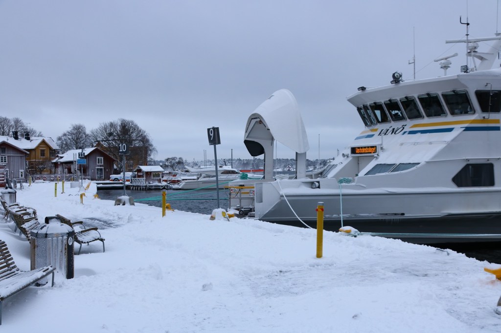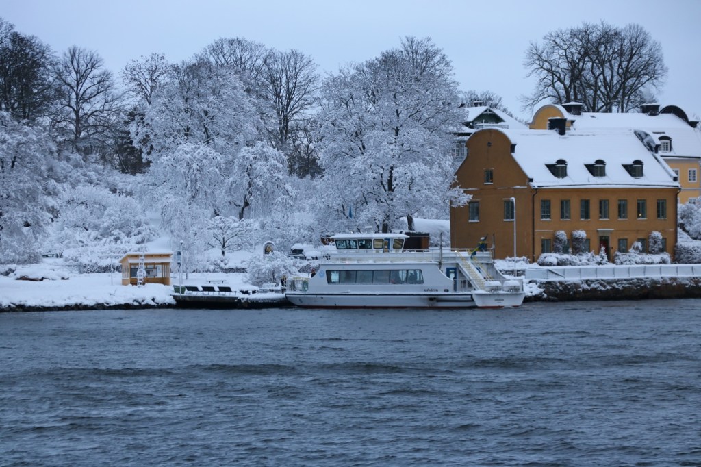 Så vintrigt och huset intill Blockhusuddens brygga för SL:s båtlinje 80 ser nästan ut som ett pepparkakshus. Den här linje 80 kallades ju länge för ”Sjövägen” och just det namnet bär båten på bilden som var den första av flera systerfartyg som dagligen kör på linjen, och som i mitt tycke är klart trevliga båtar.