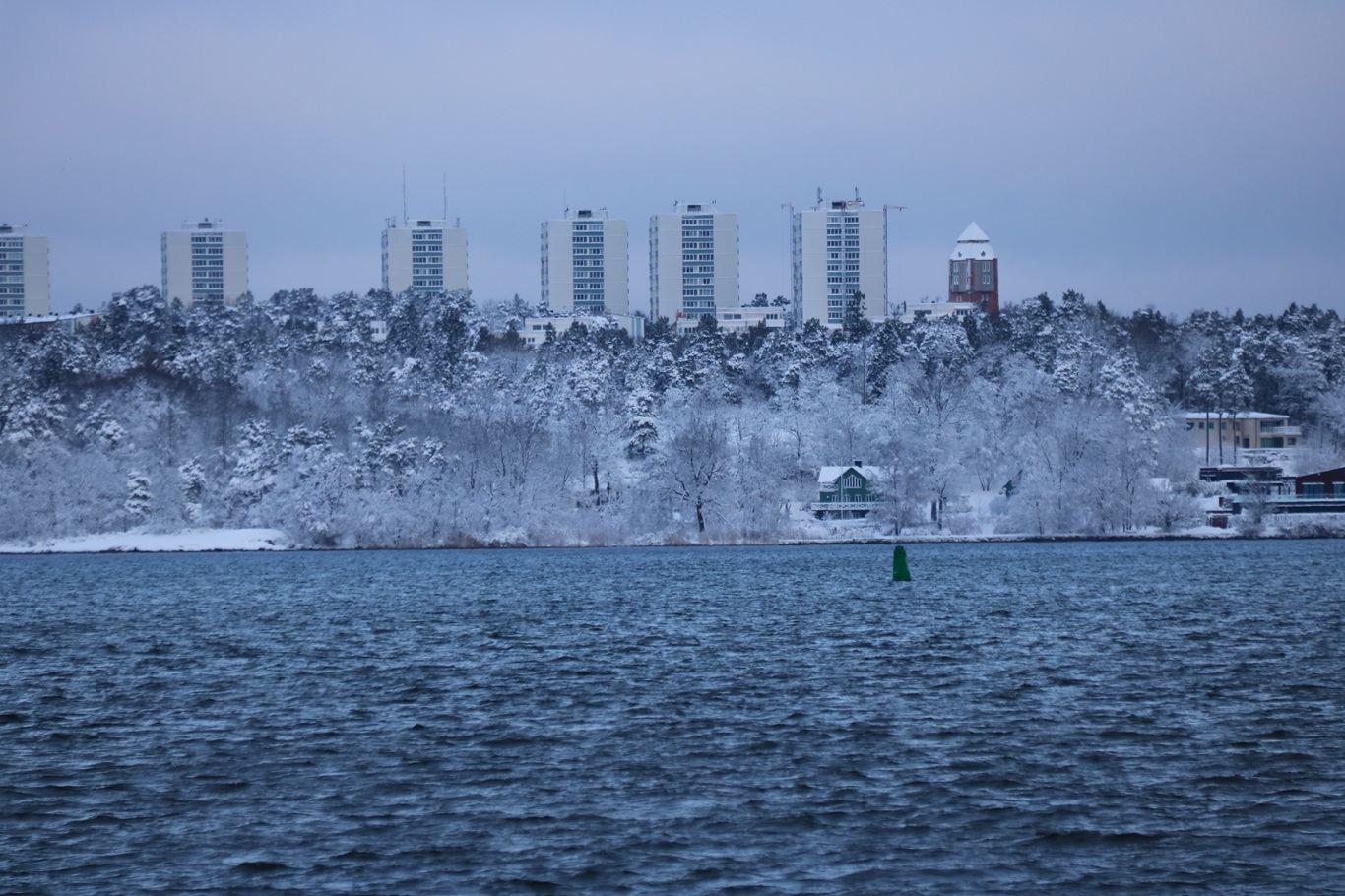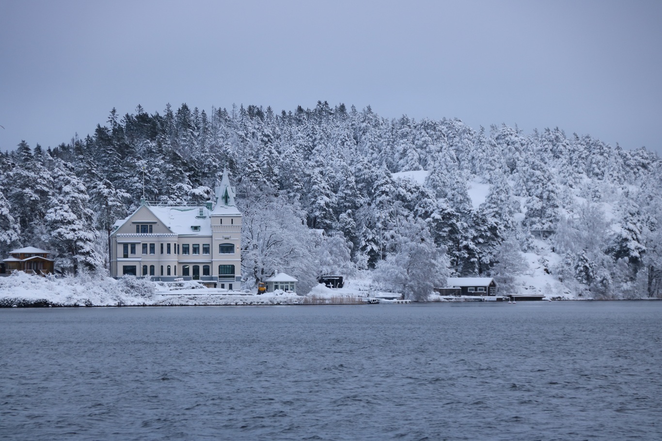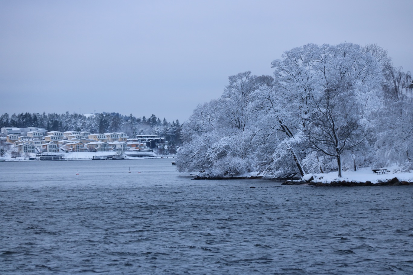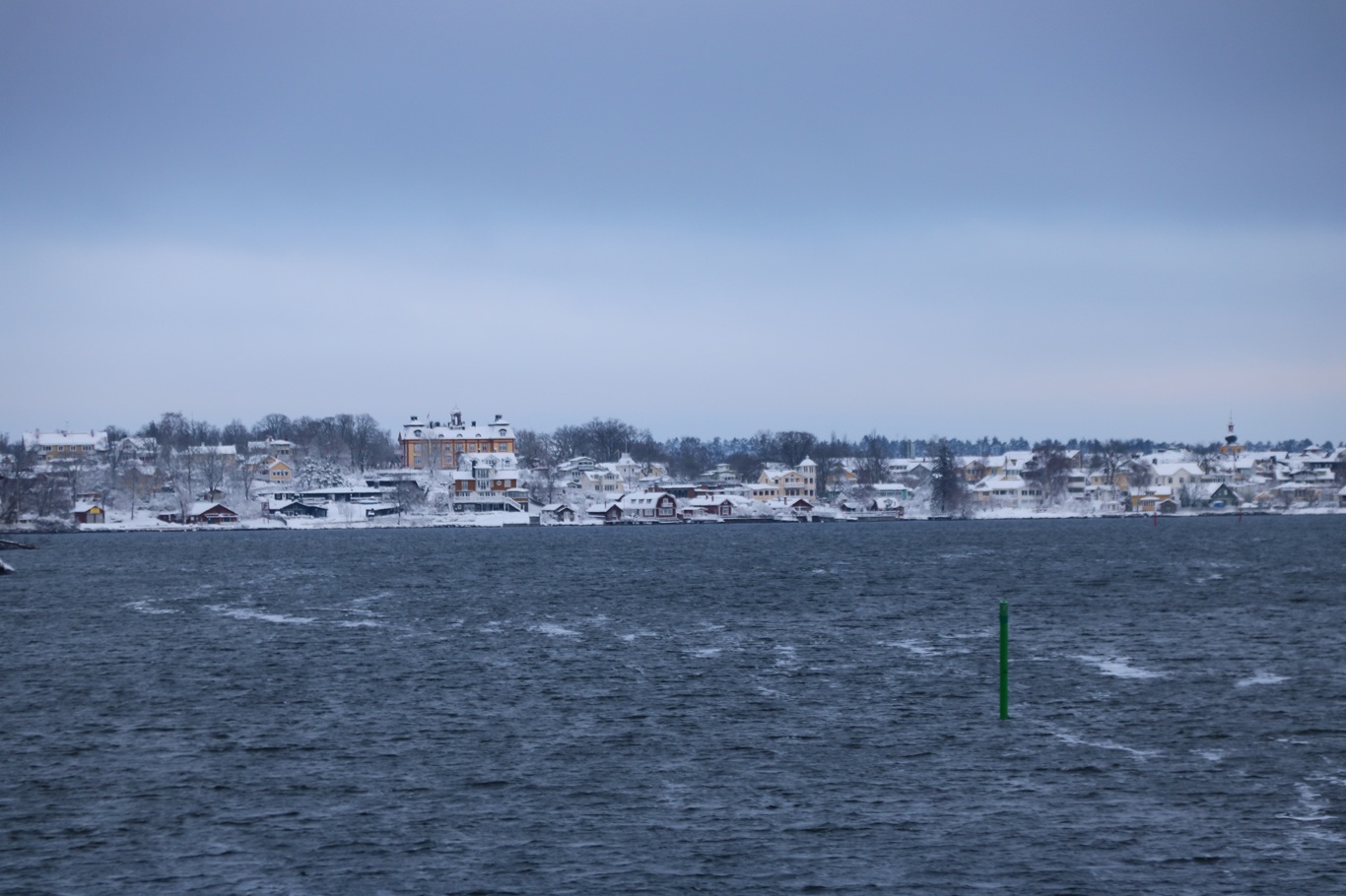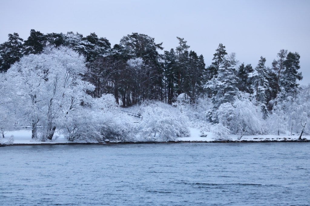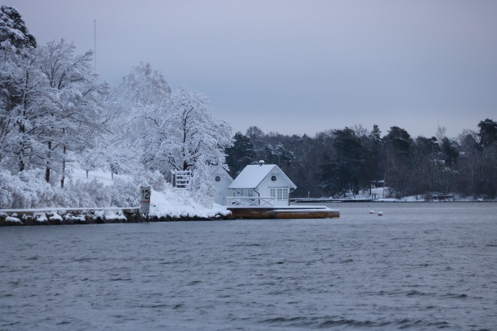 Som destinationsskylten påtalade så skulle bryggan efter Karlsudd vara Vasholmen, dit gick vi inte även om det var väldigt fagert på dess sydliga del med de snötäckta träden och det vita huset.