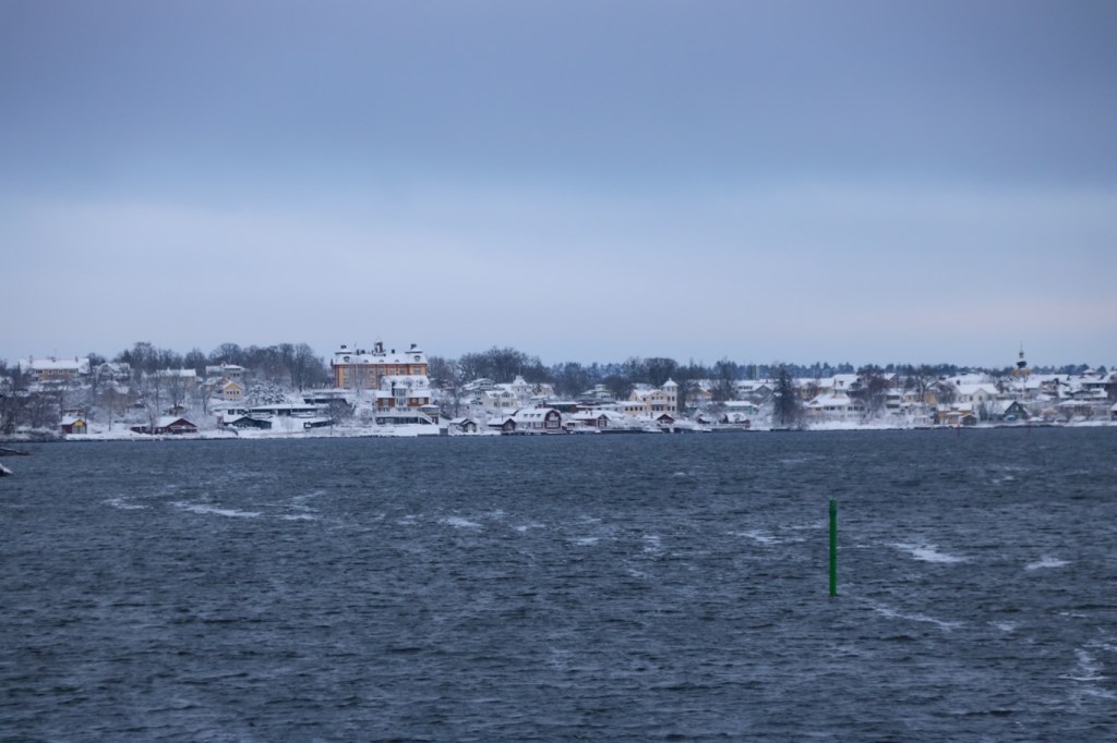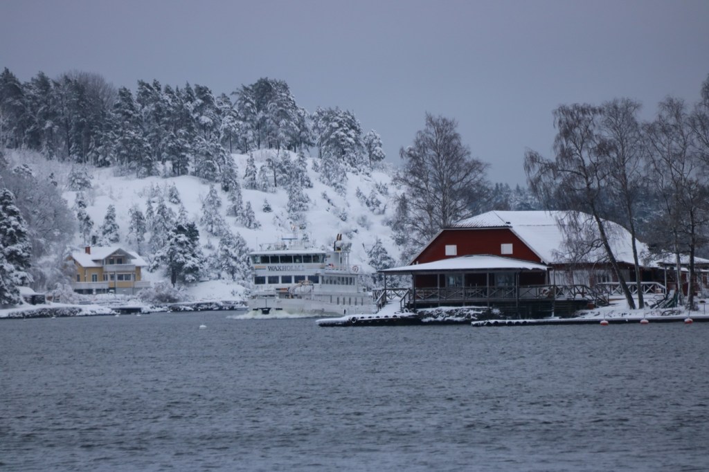 En stund i Vaxholm, vad kan aktivera en där en vinterdag? Jo exempelvis om ens mobiltelefon har dåligt batteri så kanske den behöver laddas upp någonstans, och då kan ju den dagtid öppna väntsalen i Söderhamnen nyttjas en stund innan m/s Waxholm I återkom från Rindö på tillbakafärd mot Stockholm. Jag inser att detta som allmän aktivitet är en rätt tråkig och dålig idé – som man på engelska säger ”bad” och just Badholmen är den ö som Waxholm I på bilden ska passera med dess röda hus som framför allt nyttjas som festvåning/eventlokal. Under sommaren 2025 så gick trafik med m/s Djurgården 4 ut dit från Vaxholm, en trafik som sköttes av Antrophia Rederi och som kanske mest inriktade sig på turer till Kastellet.