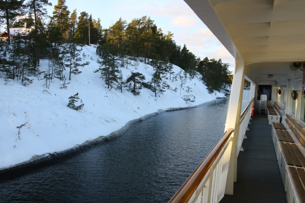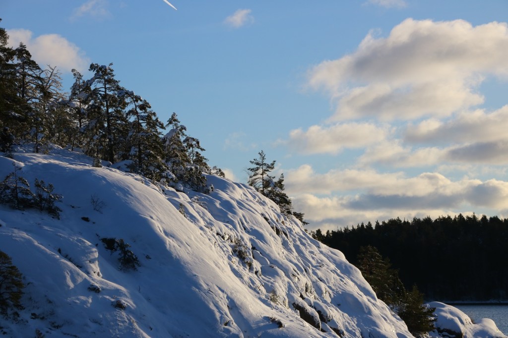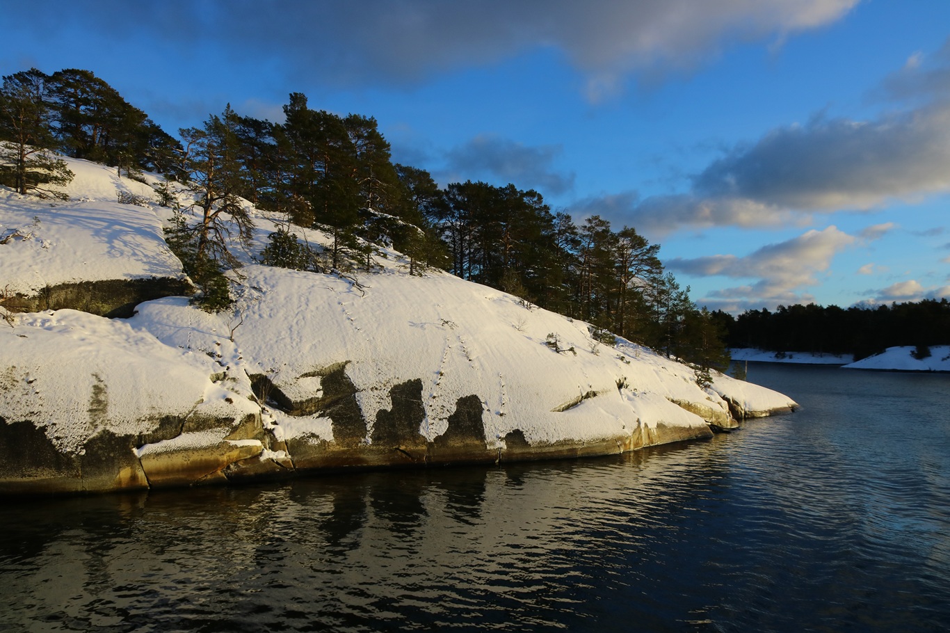 Vitklädda klippor intill Busströmmen vid Finnhamn vars brygga passerades då ingen önskade gå av. Finnhamn är ju en mer sommaraktiv ö då det är natur- och friluftsliv som är