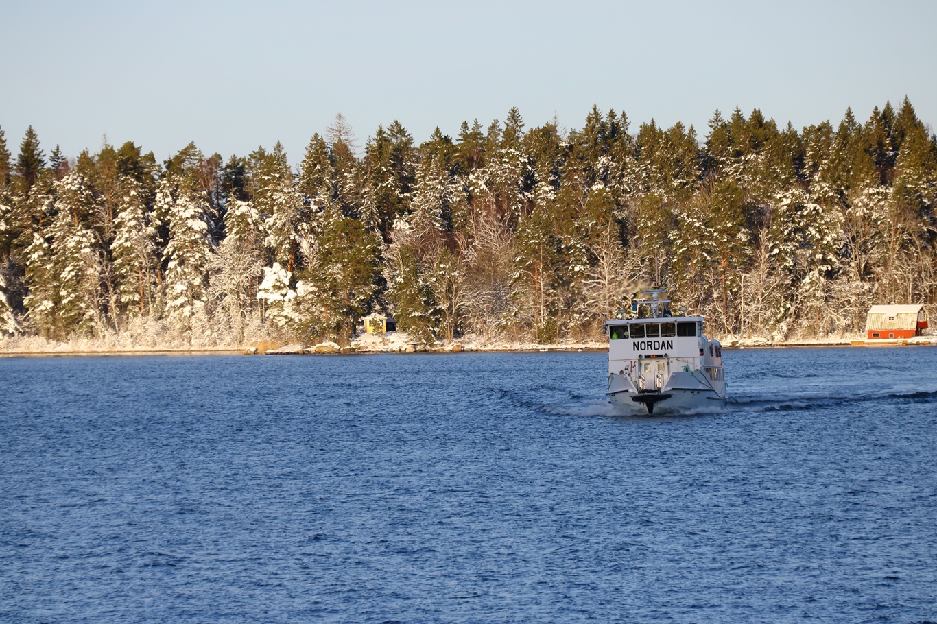 Det var en del nordlig vind idag – så det passade ju då inte fel att m/s Nordan visade sig. Under vintern kör hon isfria perioder mellan Boda och Södra Ingmarsö på vardagar.