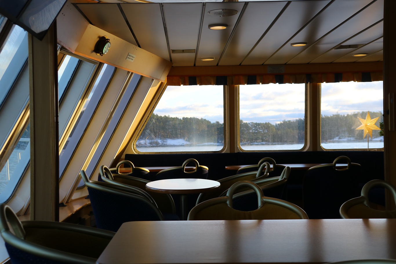 Allteftersom längs traden så töms ju båten på passagerare och när sista bryggan Husarö var på tur så var den populära förliga salongen på övre däck rätt tom – även om någon stjärna fanns kvar där (ähum…). Men det här är en mycket fin plats att observera skärgården ifrån – med en kafeteria precis akter om salongen.
