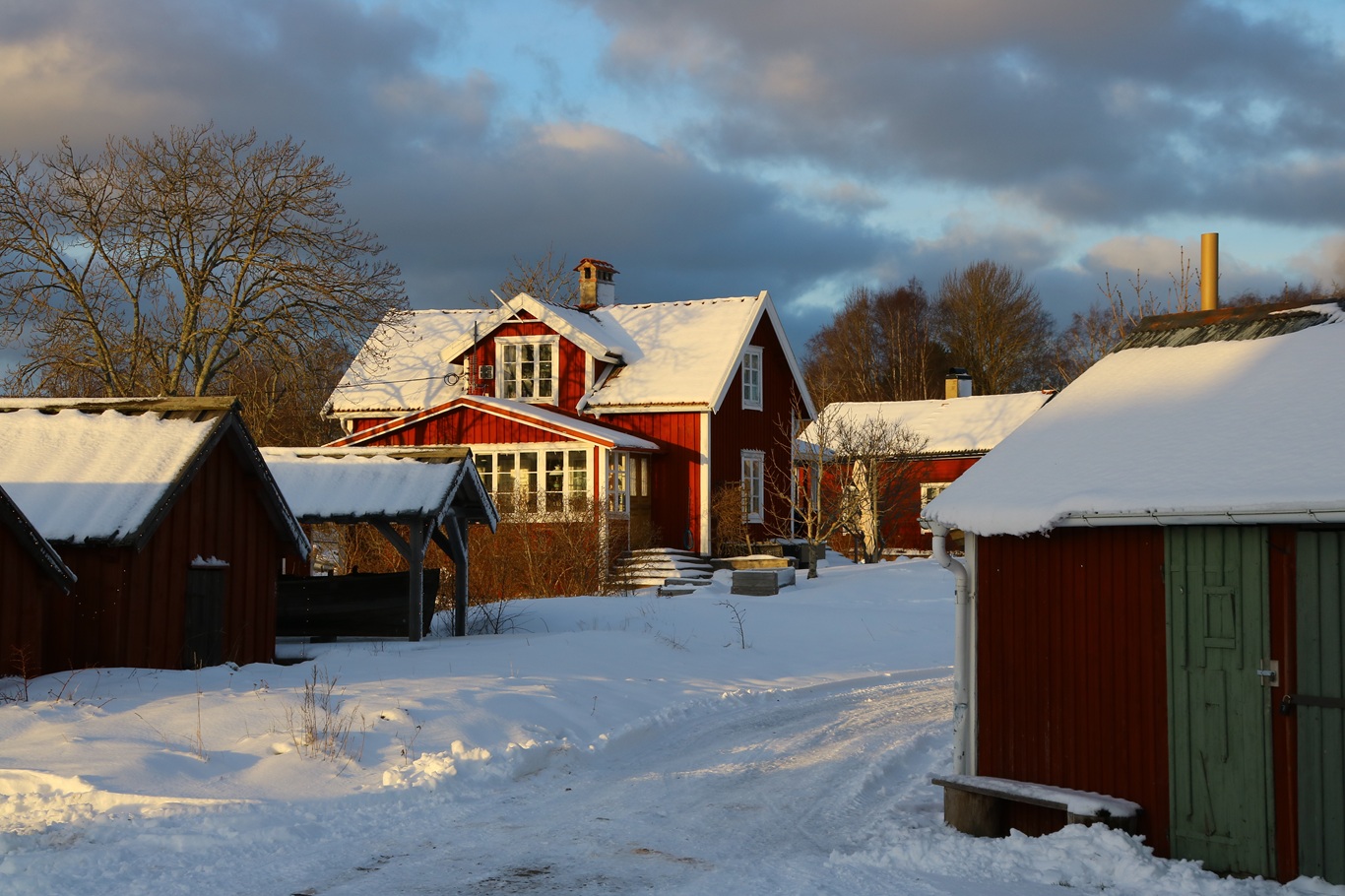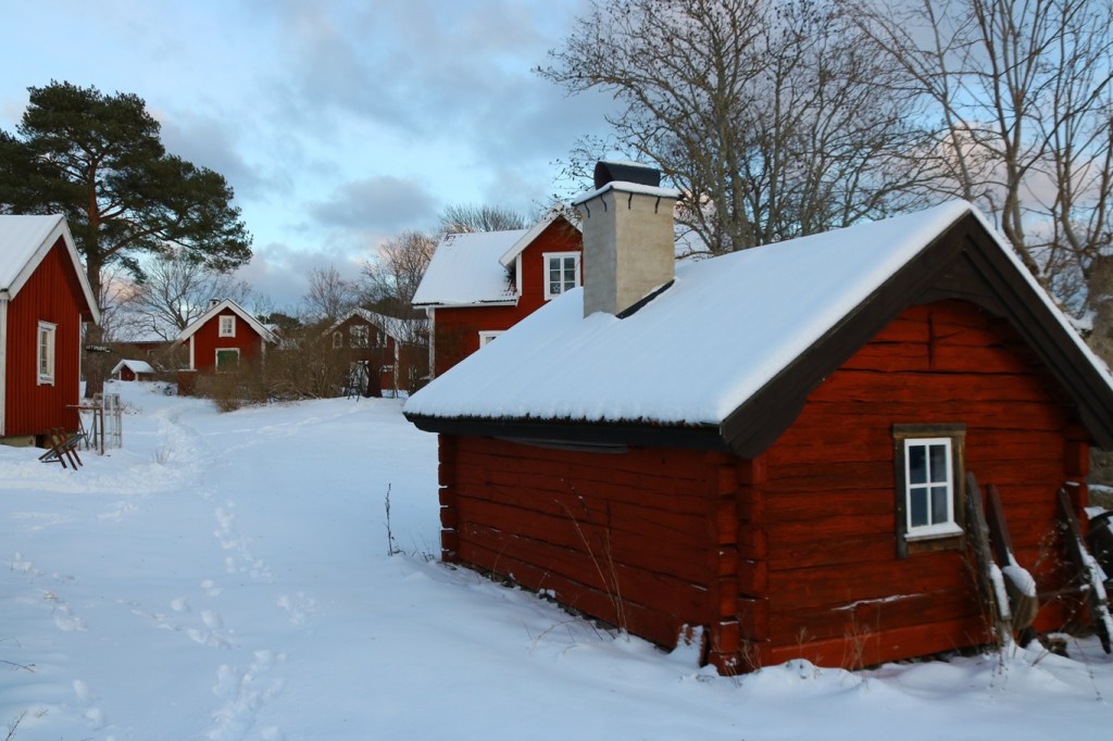 Som ett julkort stoltserar dessa röda hus där också bland dem finns Husarö lotsmuseum.