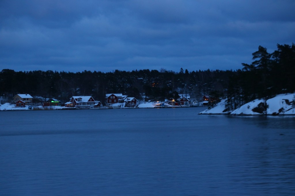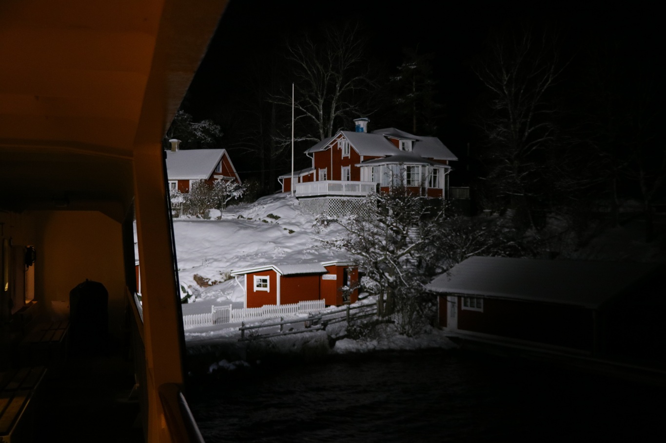 När mörket lägger sig över arkipelagen blir det lite mer kall och rå stämning och det är då skönt att vara ombord en skärgårdsbåt med ordentlig värme. Här syns Ingmarsö på håll med dess södra brygga där intill det finns både krog och affär.
