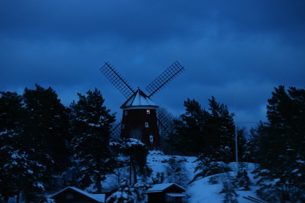 Träskökvarn uppe på sin höjd på Träskö intill Svartsö. Det vita på marken är dock inte mjöl utan snö. 😉 På en jubileumsresa med m/s Skarpö år 2015 när båten fyllde 50 år så gjordes ett uppehåll just på Träskö och med besök till kvarnen.