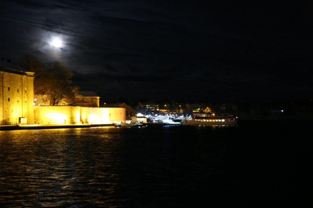M/S Rex vid Kastellet i det mysiga månskenet. Rex var alltså inte båten mot Stockholm som en turist trodde först vilken jag sedan kunde visa till rätta båten m/s Sandhamn som kom strax efteråt. Så inget besök i Vaxholm utan att vägleda någon på kajen – även om det under denna årstid görs på frivillig insats. 😉 Finns ju just nu ingen fungerande digital skylt som visar nästa avgång och kajplats i Vaxholm.